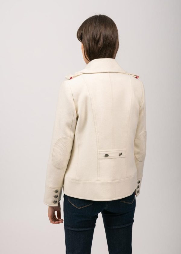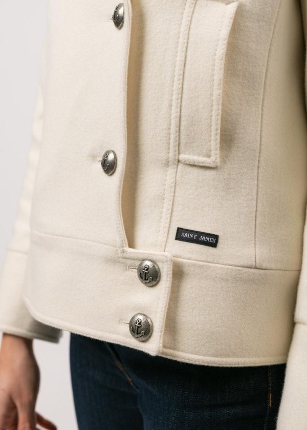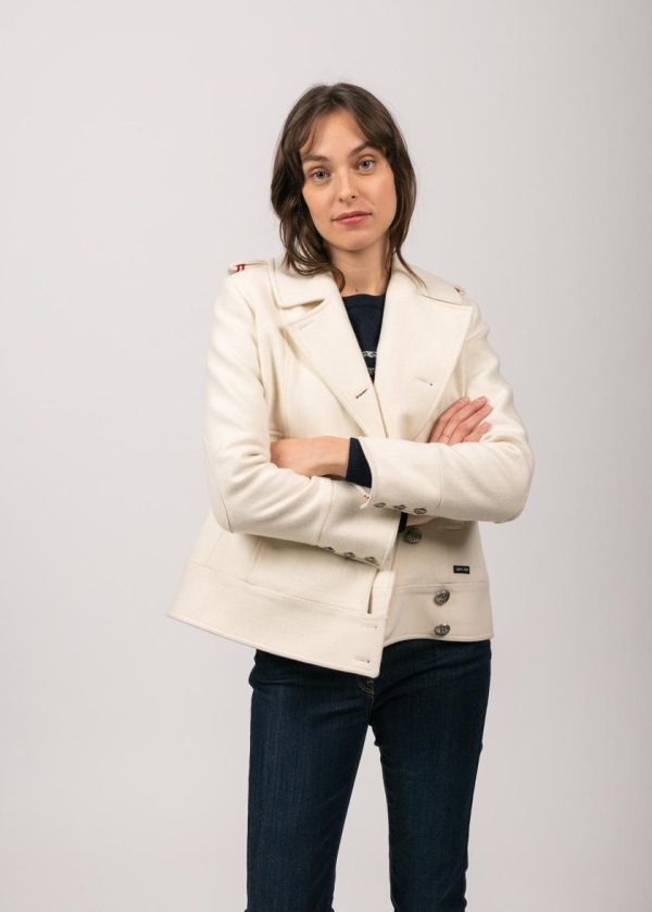 Petit caban court en drap de laine. Double boutonnage avec bouton métallique ancre. Coudières surpiquées. Petites pattes épaule avec tresse intérieure et broderie nœud marin sur le dessus. Martingale au dos avec 2 boutons. Fente en bas de manches avec 3 boutons. Doublure semi-matelassée avec une poche intérieure boutonnée.- Drap de laine