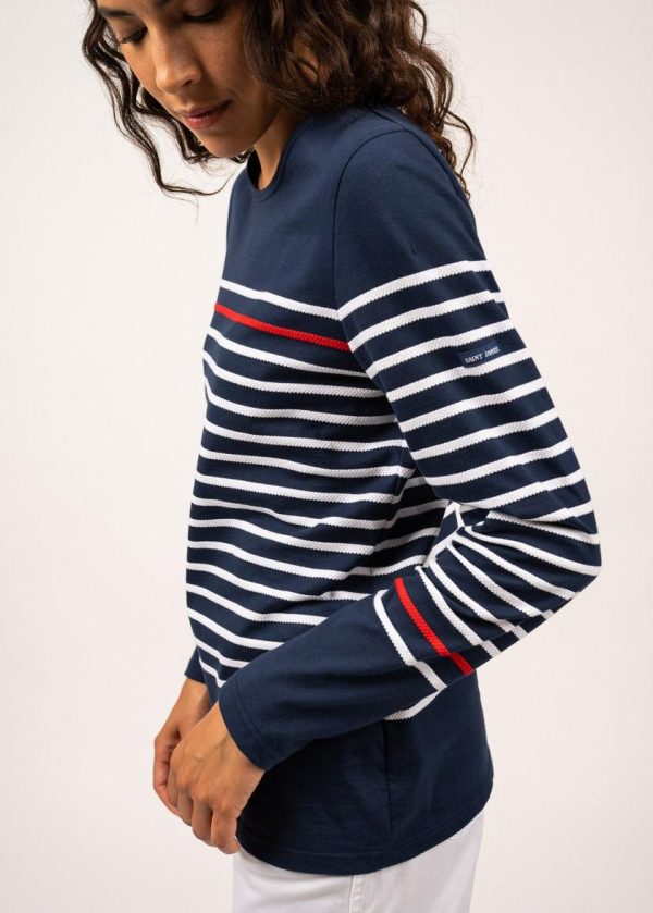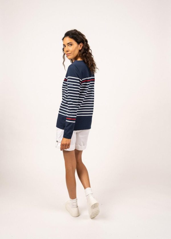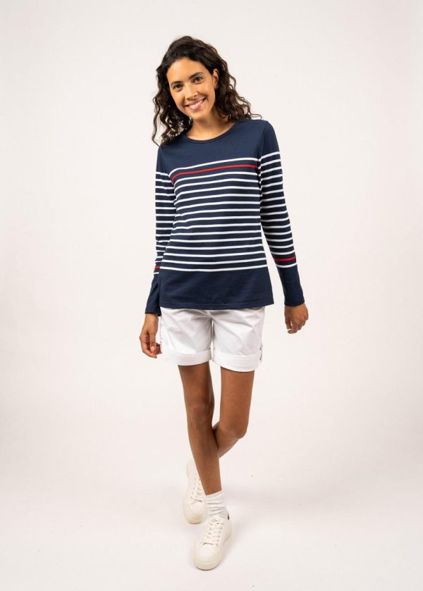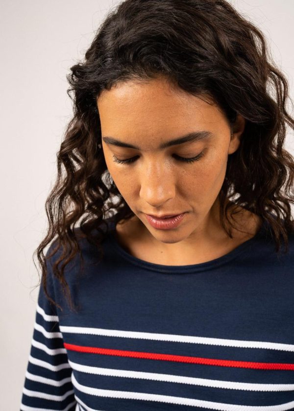 Le t-shirt Etel est un t-shirt rayé en coton, confectionné dans nos Ateliers, à Saint-James. Sur la poitrine et en bas de manches, une rayure contrastée rouge rappelle notre iconique modèle Naval. Une pièce à l’esprit marin, à associer à un jean, un short ou une jupe en jean.