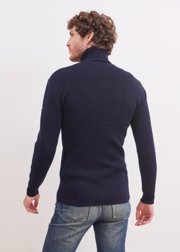 Pull col roulé 3 plis, en côte 1×1. Côte 2×2 sur le col. Bord-côte en bas de manche.- Pull
