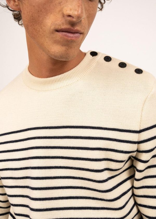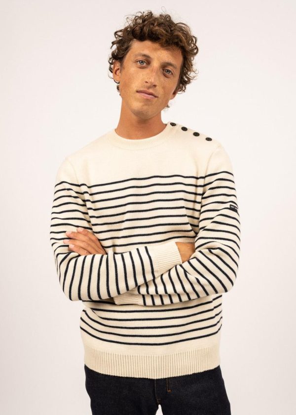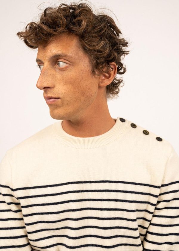 Issu de la tradition marine, le pull Binic reprend l’association des rayures et de l’empiècement uni, caractéristique des marinières. Tricoté en laine dans nos Ateliers normands, il est le témoignage de notre savoir-faire, décliné dans une version plus confortable grâce à son bord-côte en bas de corps, qui lui apporte du volume.- Pull marin