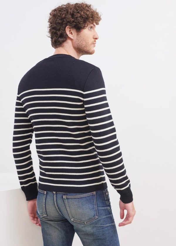 Singularisé par les rayures et le boutonnage épaule, le pull marin renouvèle sa composition : l’ajout d’acrylique téflonée confère au fil tricoté des propriétés déperlantes, réduisant la capacité de la laine à absorber l’eau.- Pull marin